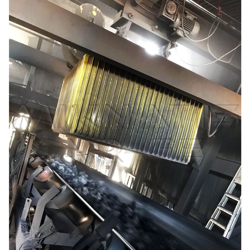 Suspended Electromagnet allows collecting unwanted ferromagnetic (Fe) wastes such as free iron and steel from transported materials. Electromagnetic Plates are mounted or suspended above the feeding conveyor belt to separate large pieces of metal that pose a hazard to crushers, mills and grinders. Suspended Electromagnetic Plates can also separate sharp metals that can damage or tear conveyor belts, especially at transfer points. Electromagnets are heavy, solid and powerful. Thanks to its very strong magnetic field effect, it can easily magnetise large pieces of iron from a longer effective distance. However, it is important that the feed belt chassis just below the magnet, the rollers are of non-magnetic material or it will become magnetised in the chassis. The electromagnet can be turned off for service or cleaning purposes.
